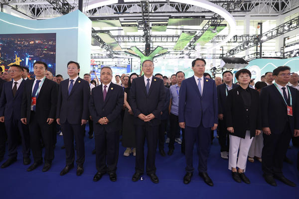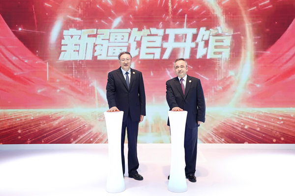 12時(shí)30分,李邑飛、艾爾肯·吐尼亞孜共同啟動(dòng)激光柱,為新疆館開館,并和與會(huì)嘉賓參觀展廳,近距離感受新疆在經(jīng)貿(mào)、科技、文旅等領(lǐng)域取得的豐碩成果。