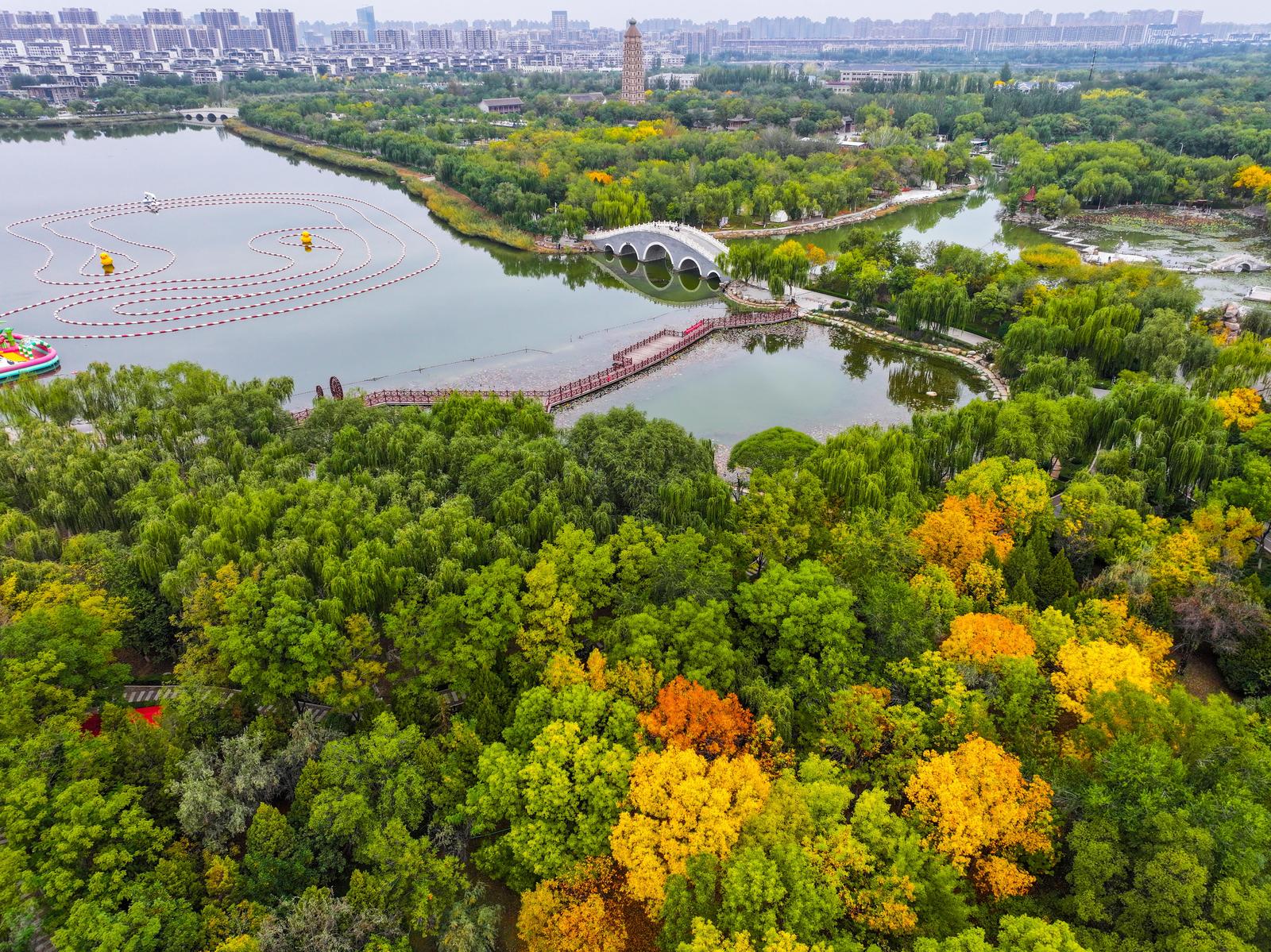 10月9日,俯瞰銀川海寶公園,仿佛走進(jìn)了夢(mèng)幻般的秋日童話世界。寒露已過(guò),湖城銀川的公園里各種樹(shù)木的葉子紛紛變黃,構(gòu)成了一幅生動(dòng)的秋日畫卷。 記者 馬楠 攝