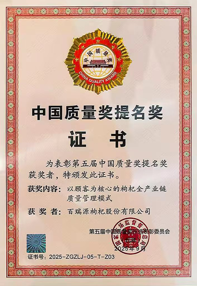 寧夏新聞網(wǎng)訊(記者 祁瀛濤)9月16日,第六屆中國質(zhì)量大會(huì)在南京隆重召開,中國質(zhì)量領(lǐng)域最高榮譽(yù)——第五屆中國質(zhì)量獎(jiǎng)?wù)浇視裕瑢幭陌偃鹪磋坭焦煞萦邢薰荆ê喎Q“百瑞源”)憑借以顧客為核心的枸杞全產(chǎn)業(yè)鏈質(zhì)量管理模式,與伊利集團(tuán)、五糧液集團(tuán)等78家企業(yè)共同榮獲中國質(zhì)量提名獎(jiǎng),成為中國枸杞行業(yè)唯一獲得中國質(zhì)量獎(jiǎng)提名獎(jiǎng)的品牌。從2014年斬獲“銀川市首屆市長質(zhì)量獎(jiǎng)”,到2016年榮膺“自治區(qū)省級質(zhì)量獎(jiǎng)”,再到如今榮獲“中國質(zhì)量獎(jiǎng)提名獎(jiǎng)”,“質(zhì)量進(jìn)階之路”堪稱十年磨一劍,進(jìn)一步凸顯了百瑞源在中國枸杞行業(yè)的領(lǐng)導(dǎo)地位。