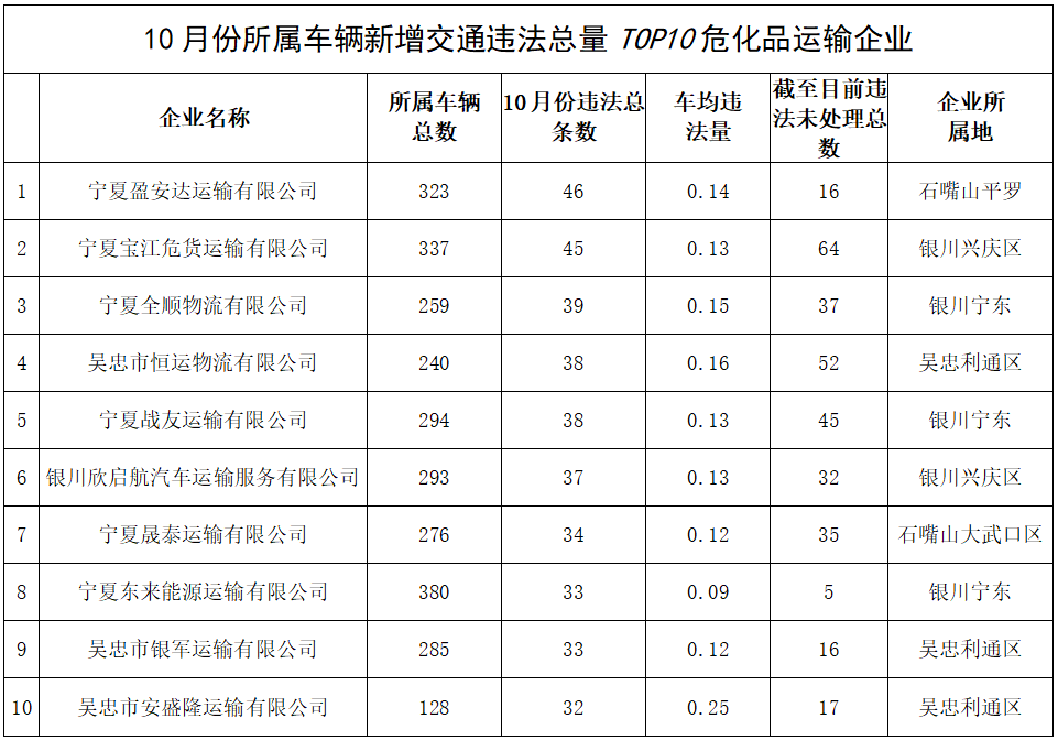 經(jīng)過統(tǒng)計分析發(fā)現(xiàn),與上月相比,10月份所屬車輛新增交通違法量最多的10家?;愤\輸企業(yè)中,有7家企業(yè)再次“上榜”。排在“榜首”的依舊是寧夏盈安達(dá)運輸有限公司(46條),車均違法量最多的企業(yè)是吳忠市安盛隆運輸有限公司(0.25條),截至目前違法未處理數(shù)量最多的企業(yè)是寧夏寶江危貨運輸有限公司(64條)。10月份全區(qū)交通違法量最多的危化品運輸車輛分別是寧夏安捷運輸有限公司的寧AS0290(6條)以及寧夏嘉順安物流有限公司的寧CE1933(5條)、寧夏晟泰運輸有限公司的寧B33879(5條)。具體曝光名單如下: