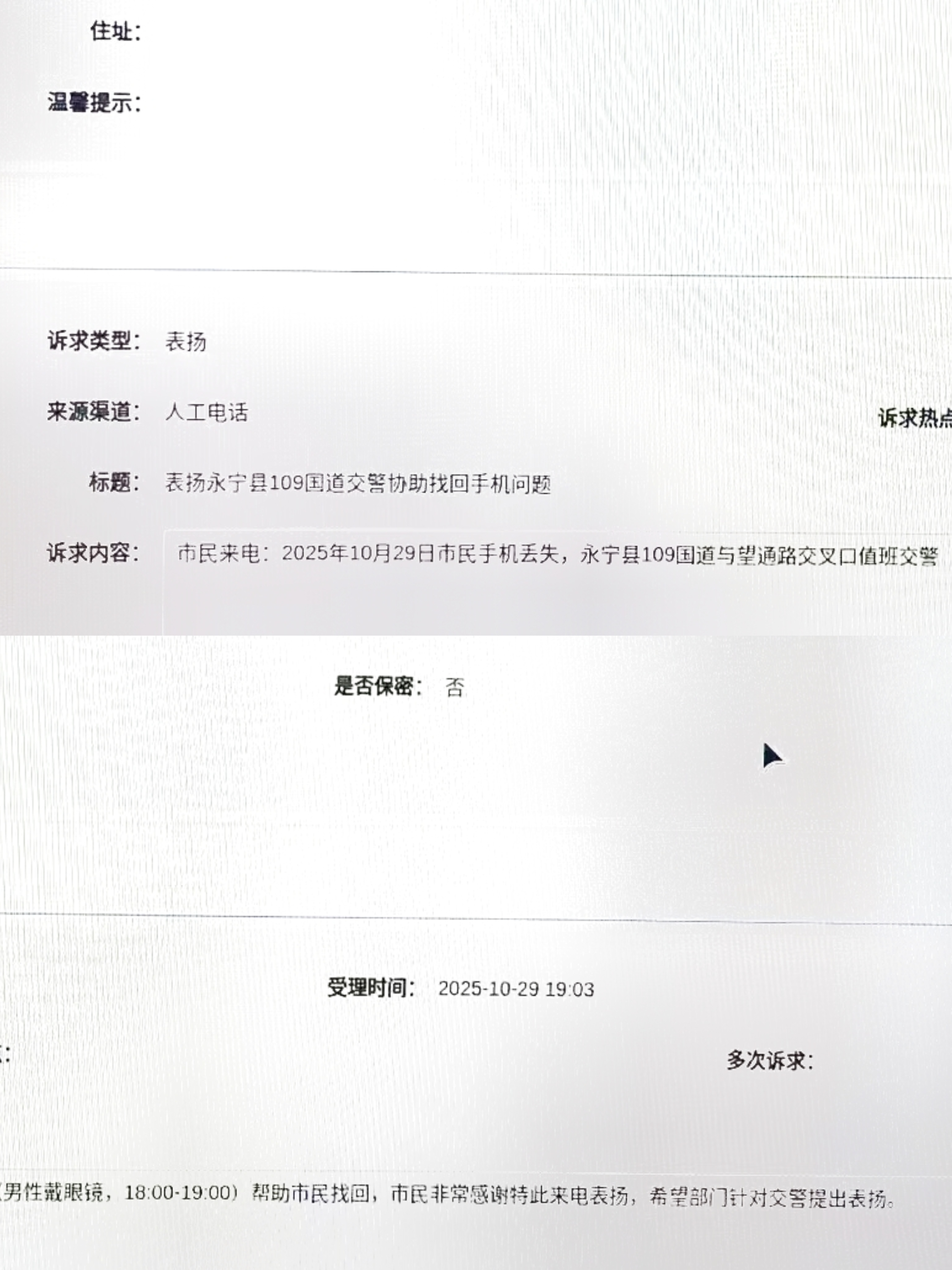 第二天,手機失主撥打了12345市民熱線,稱因當時著急找回手機,沒有詢問執(zhí)勤交警的姓名。想要通過這樣的方式,對幫助找回手機的執(zhí)勤交警表示感謝。(永寧縣公安局交通管理大隊)